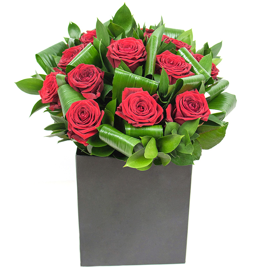 Experience the timeless beauty of our exquisite red roses, gracefully combined with lush aspidistra leaves and delicate ruscus. This unique arrangement adds a touch of sophistication and elegance to any space.