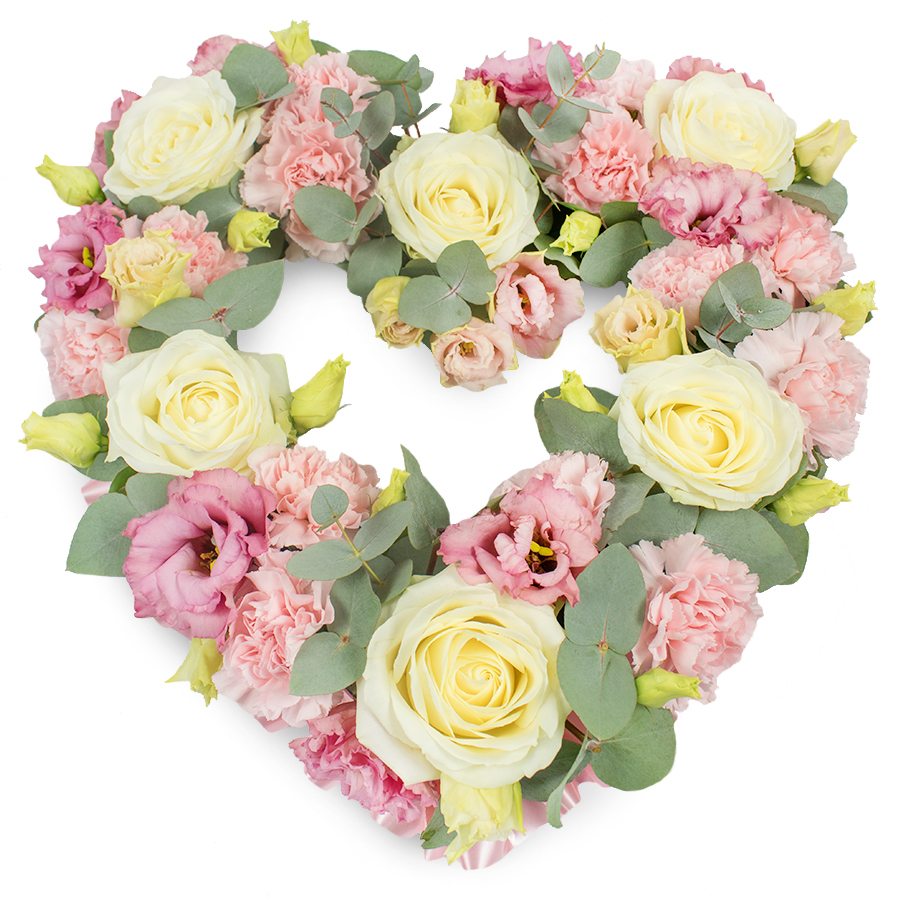 Convey your deepest emotions with our lovely open heart floral tribute. This charming bouquet blends white roses, pink carnations, pink lisianthus, and eucalyptus leaves, all meticulously hand-selected for their vibrant colors and outstanding freshness.